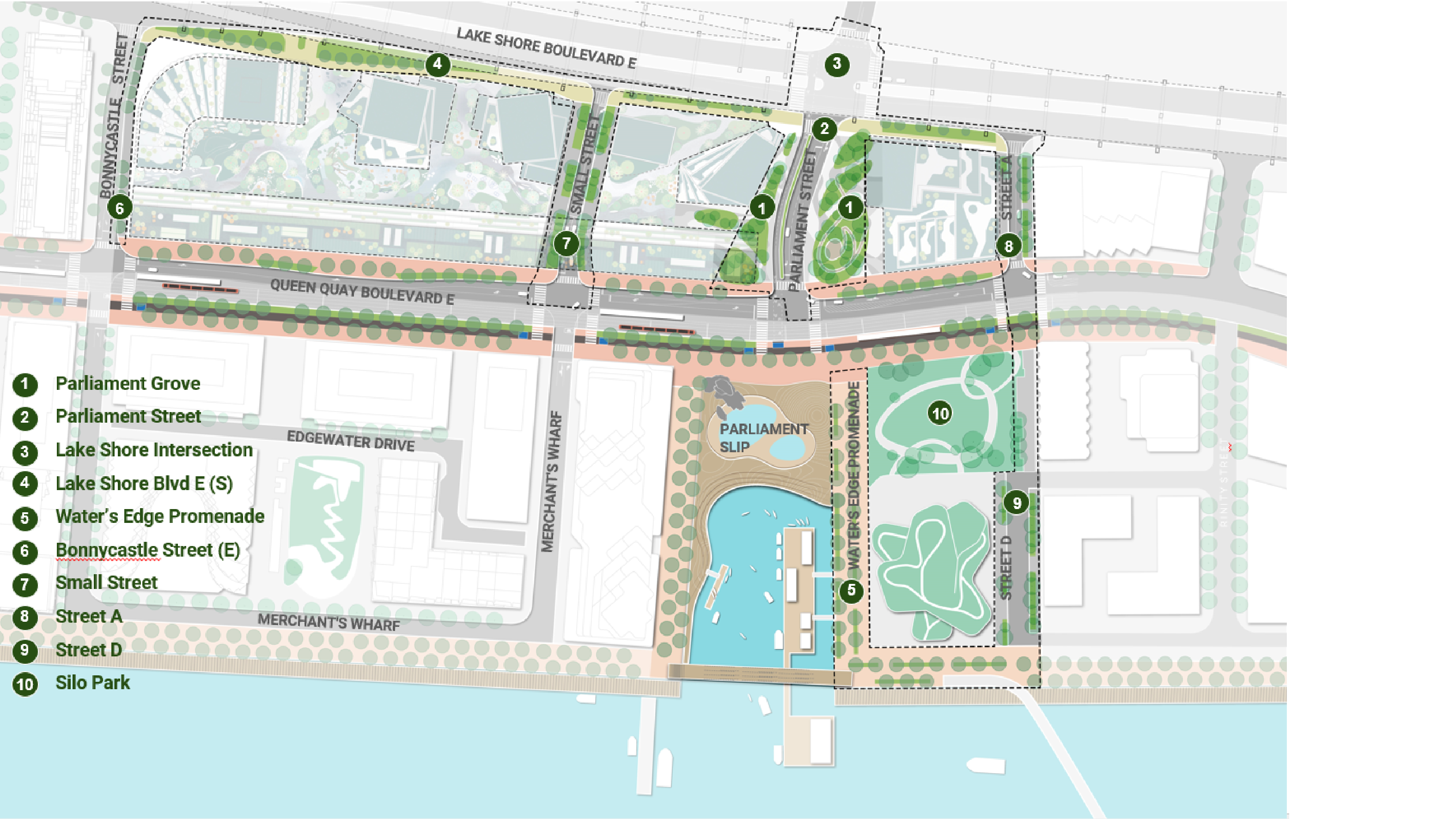 - The designs for the local streets, Queens Quay East, Lake Shore Boulevard East, Parliament Street and Parliament Grove, and Water’s Edge Promenade prioritize green infrastructure, ecological performance, and health and well-being.