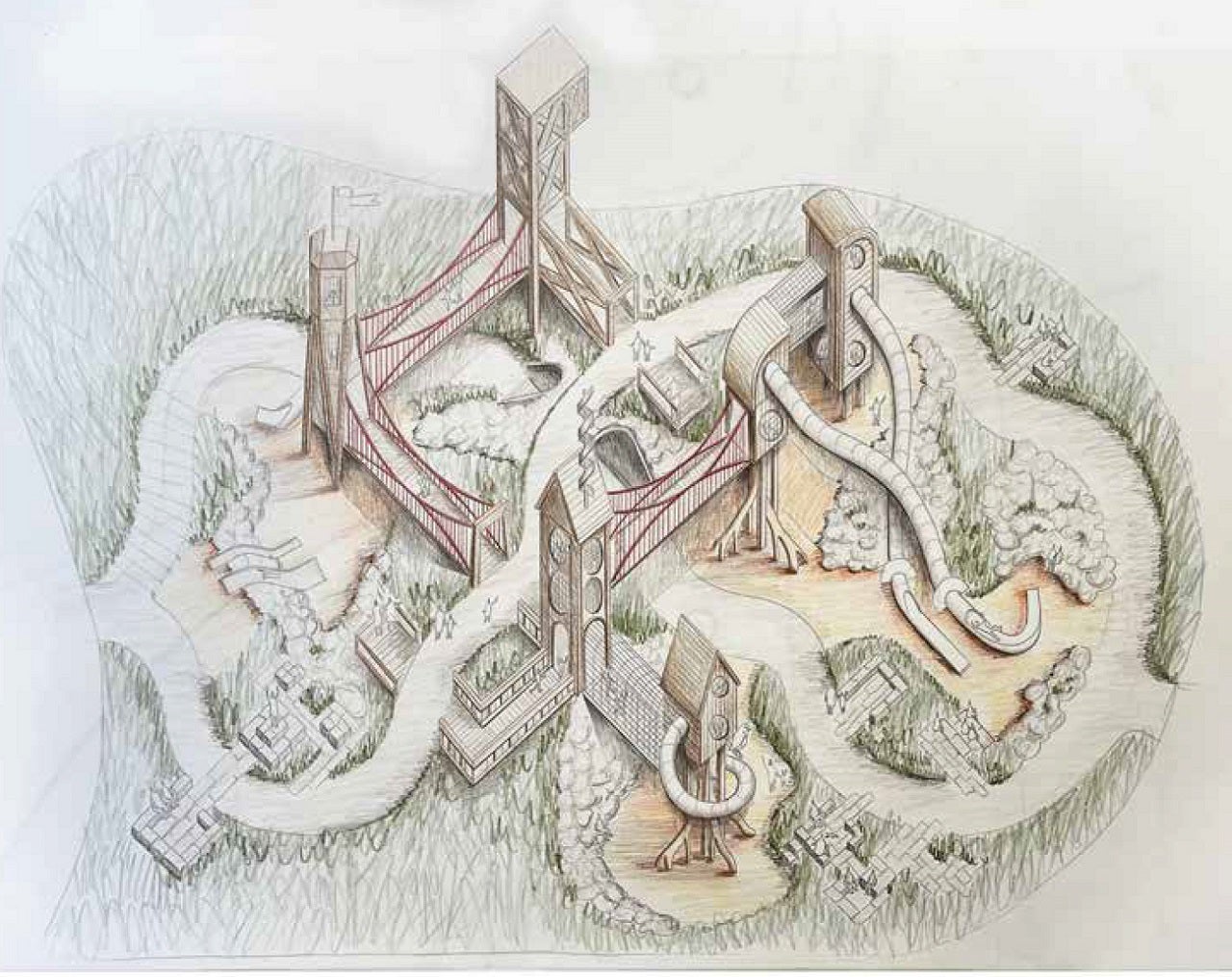 As most parents know, kids can turn almost anywhere into a play environment. This is a humbling fact for a playground designer to recognize, but it is also key to understanding the need for interpretive flexibility within a play landscape. A single landscape element, intriguing but not representational, can be interpreted in a range of ways for different play purposes. Although our designs also utilize recognizable elements, sometimes in extraordinary forms, we guard against the type of over detailing that can have the unintended effect of limiting the amount of fun that a child might create on their own.