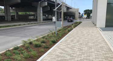 Construction began in August 2020 and was completed in September 2020. The existing concrete sidewalk has been reconstructed using porous pavers over a permeable sub-base instead of concrete, allowing stormwater to be retained on site and slowly filter through, thereby reducing the flow of water into storm sewers. This captured stormwater is used as a resource for passive irrigation of the adjacent planting area along the curb, improving plant health and reducing the need for manual watering. Plants selected are resilient hardy species resistant to shade, wind, and salt, while adding to the biodiversity of the corridor. The intersection corner at Bonnycastle St. was rebuilt in an enhanced concrete finish with exposed granite aggregate and a decorative sawcut pattern which is to highlight pedestrian areas at intersections across the Lake Shore Blvd. streetscape.